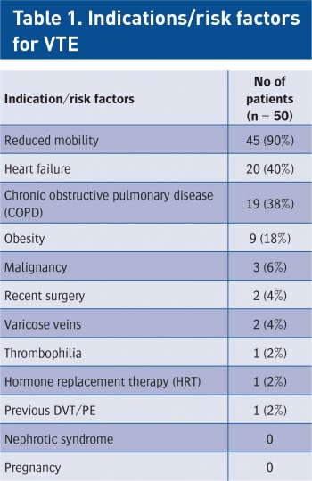 This was a prospective data analysis. The patients were adults (over the age of 18 years) of both gender admitted under the medical team from March 14, 2015 to March 20, 2015. Inpatient charts during this period were reviewed and data was recorded in a predesigned structured proforma. Exclusion criteria included: age less than 18 years, non-inpatients (outpatients department, medical assessment unit, emergency department attendees) and patients admitted to hospital with a diagnosis of DVT or PE.