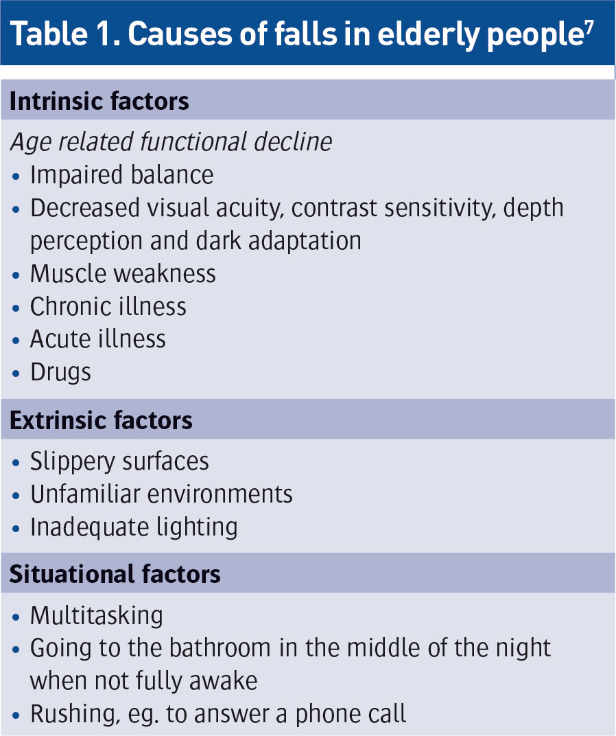 With advances in modern medicine, human beings today are living longer than ever before. As the geriatric population of the world rises, new health challenges are coming to the fore. One such challenge is falls in elderly people. People over 65 years of age represent only 12% of the population, but account for 75% of deaths from falls.5 Every year, 30-40% of elderly people living in the community and 60% living in nursing homes are affected by falls.6 Causes of falls in elderly people are outlined in Table 1.