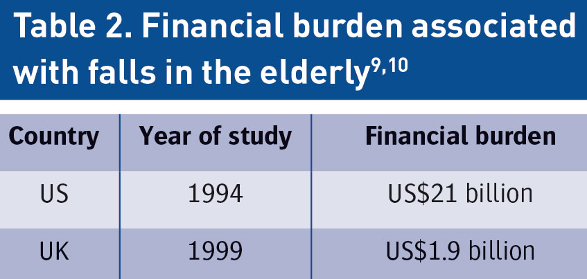 Hospital stays have been recorded to be twice as long for falls-prone patients than age-matched controls who do not fall.5 The consequences of an older person falling can range from minor injury to major trauma. Hip fractures occur in 1-2% of all falls in elderly people.8 Head trauma, soft tissue injuries and dislocations are also commonly seen. An even heavier price to pay is the psychological fear of falling, which leads to self-restriction of activities.5