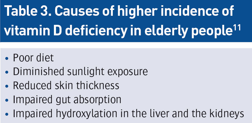 Elderly people are a population that is more susceptible to vitamin D deficiency. In a study of 824 people above the age of 70 in 11 European countries, 36% of men and 47% of women were found to be vitamin D deficient.11Table 3 sets out causes of higher incidence of vitamin D deficiency in elderly people.