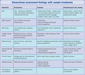 The physiotherapist uses this information (particularly the list of impairments) to develop a ‘best-fit’ hypothesis for the cause of the patient’s problem and this in turn provides a rational framework for physiotherapy treatment.
