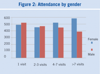 Figure 2 shows attendance breakdown by gender for each of the visit bands. Figure 3 shows the attendance breakdown by patient type for each of the visit bands.