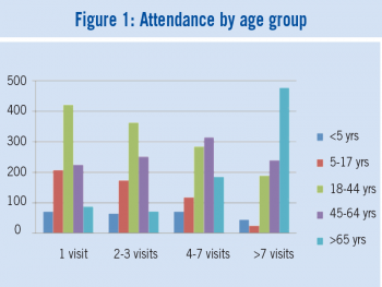 Comparison of mean total visits was carried out for both gender and patient type groups, using an independent samples t-test. Comparison of mean total visits for the different age groups was carried out using one-way analysis of variance (ANOVA). Statistical analysis was carried out using PASW  Statistics 18 statistical analysis software.