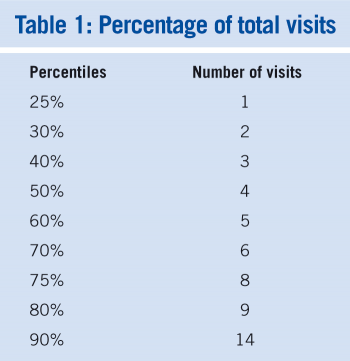 Frequent attenders were defined by analysis of the total visits data as the set of individuals with greater than or equal to the 75th centile of visits. Table 1 shows a breakdown of visit totals for individual patients into various centiles.