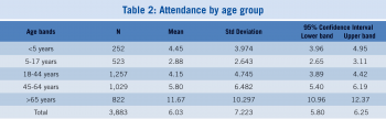 Table 2 shows the attendance statistics for the various age bands. These show that attendance was higher in the <5 age group than in the 5-17 and 18-44 age groups. Attendance then rises for the 45-64 age group, with the most significant rise being in the >65 age group. This was found to be statistically significant (F=212.476, p<0.001). These results are displayed graphically in Figure 1