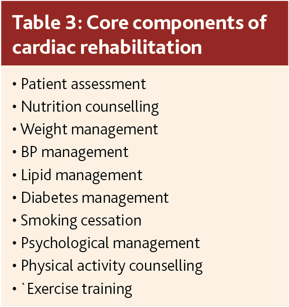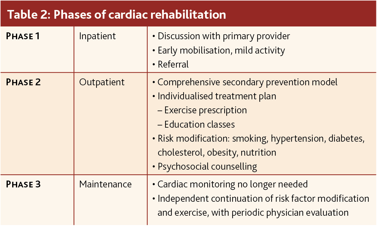 Traditionally, CR is divided into three phases. These consist of inpatient, outpatient and independent maintenance (see Table 2).15,18 Physician referral should ideally occur in phase 1 to optimise CR uptake. However, due to the complexities of inpatient and discharge management, physicians often omit this referral. Patients, particularly women, are therefore discharged without a meaningful insight into the benefits of attending CR. Women patients often find it increasingly more challenging to self-advocate than their male cohort.2,3