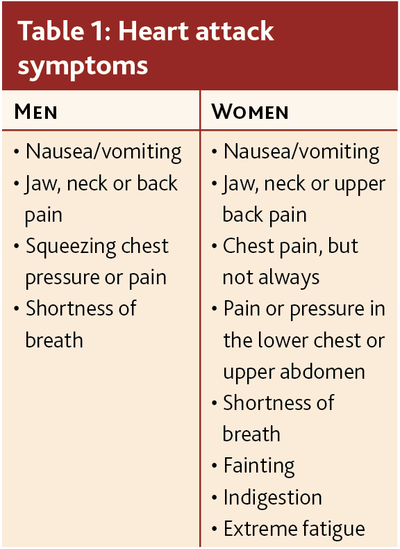 Once women reach menopause, the cardioprotection of oestrogen erodes.7 Menopausal transitioning is a time of accelerated CVD risk for women, as depleting oestrogen levels adversely affect the distribution of body fat, vascular health and lipid profiles. Treating women with hormone replacement therapy can have beneficial effects on cholesterol; however, it does not prevent CVD from occurring.12 During this period, women often experience vague symptoms of CVD and do not identify with textbook male symptoms (see Table 1), which can often delay the diagnosis of CVD by practitioners.2,13 Coupled with less aggressive treatment plans, when women are referred to CR, they are older with multiple comorbidities, musculo-skeletal disorders, decreased functional capacity and worse exercise tolerance than men.14
